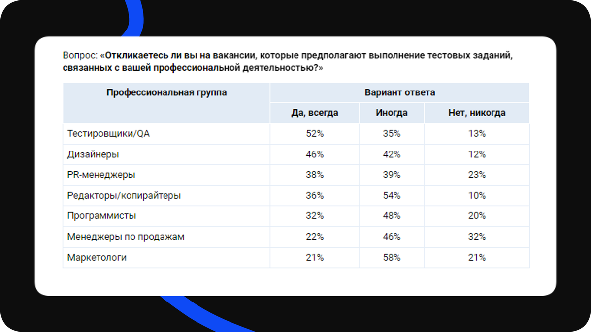 Π 2021 Π³ΠΎΠ΄Ρ Π² SuperJob ΠΏΡΠΎΠ²Π΅Π»ΠΈ Π½Π΅Π±ΠΎΠ»ΡΡΠΎΠ΅ ΠΈΡΡΠ»Π΅Π΄ΠΎΠ²Π°Π½ΠΈΠ΅, Π² Ρ ΠΎΠ΄Π΅ ΠΊΠΎΡΠΎΡΠΎΠ³ΠΎ ΠΎΠΏΡΠΎΡΠΈΠ»ΠΈ ΠΏΠΎ 200 ΠΏΡΠ΅Π΄ΡΡΠ°Π²ΠΈΡΠ΅Π»Π΅ΠΉ ΠΊΠ°ΠΆΠ΄ΠΎΠΉ ΠΏΡΠΎΡΠ΅ΡΡΠΈΠΎΠ½Π°Π»ΡΠ½ΠΎΠΉ Π³ΡΡΠΏΠΏΡ, Π² ΡΠΎΠΌ ΡΠΈΡΠ»Π΅ ΠΏΡΠΎΠ³ΡΠ°ΠΌΠΌΠΈΡΡΠΎΠ² ΠΈ ΡΠ΅ΡΡΠΈΡΠΎΠ²ΡΠΈΠΊΠΎΠ². Π ΠΎΠΊΠ°Π·Π°Π»ΠΎΡΡ, ΡΡΠΎ 20% ΠΎΠΏΡΠΎΡΠ΅Π½Π½ΡΡ ΠΏΡΠΎΠ³ΡΠ°ΠΌΠΌΠΈΡΡΠΎΠ² Π²ΡΠ΅Π³Π΄Π° ΠΎΡΠΊΠ°Π·ΡΠ²Π°ΡΡΡΡ Π²ΡΠΏΠΎΠ»Π½ΡΡΡ ΡΠ΅ΡΡΠΎΠ²ΠΎΠ΅ Π·Π°Π΄Π°Π½ΠΈΠ΅, Π° ΠΏΠΎΡΡΠΈ ΠΏΠΎΠ»ΠΎΠ²ΠΈΠ½Π° ΡΠ°Π·ΡΠ°Π±ΠΎΡΡΠΈΠΊΠΎΠ² (48%) β Π΄Π΅Π»Π°Π΅Ρ Π΅Π³ΠΎ, Π½ΠΎ Π²ΡΠ±ΠΎΡΠΎΡΠ½ΠΎ. Π’ΠΎΠ»ΡΠΊΠΎ 31% ΠΏΡΠΎΠ³ΡΠ°ΠΌΠΌΠΈΡΡΠΎΠ² Π²ΡΠ΅Π³Π΄Π° ΡΠΎΠ³Π»Π°ΡΠ°Π΅ΡΡΡ Π½Π° ΡΠ΅ΡΡΠΎΠ²ΠΎΠ΅ Π·Π°Π΄Π°Π½ΠΈΠ΅.