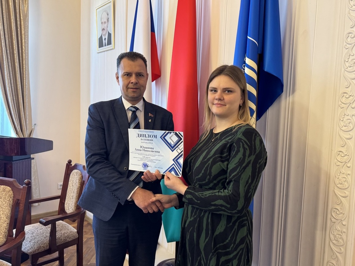 🏛 В Белорусско-Российском университете прошло награждение победителей конкурса разработок/проектов кураторов учебных групп. В номинации "Качество во всем — залог процветания" дипломы второй степени были вручены Анне Юмановой и Дмитрию Якубовичу. Их проекты продемонстрировали высокий уровень подготовки и инновационный подход, что стало залогом их успеха в этом конкурсе.
