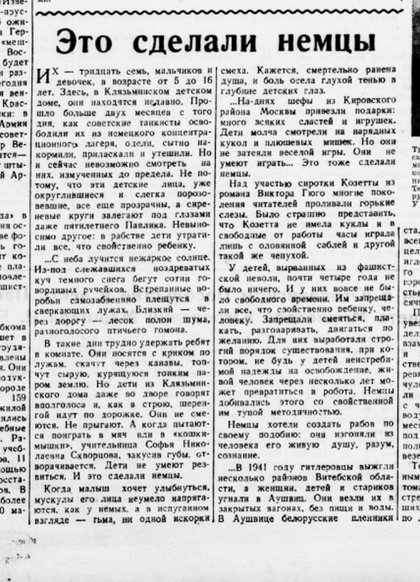 …На днях шефы из Кировского района Москвы привезли подарки: много всяких сластей и игрушек. Дети молча смотрели на нарядных кукол и плюшевых мишек. Но они не затеяли веселой игры. Они не умеют играть… Это тоже сделали немцы.
