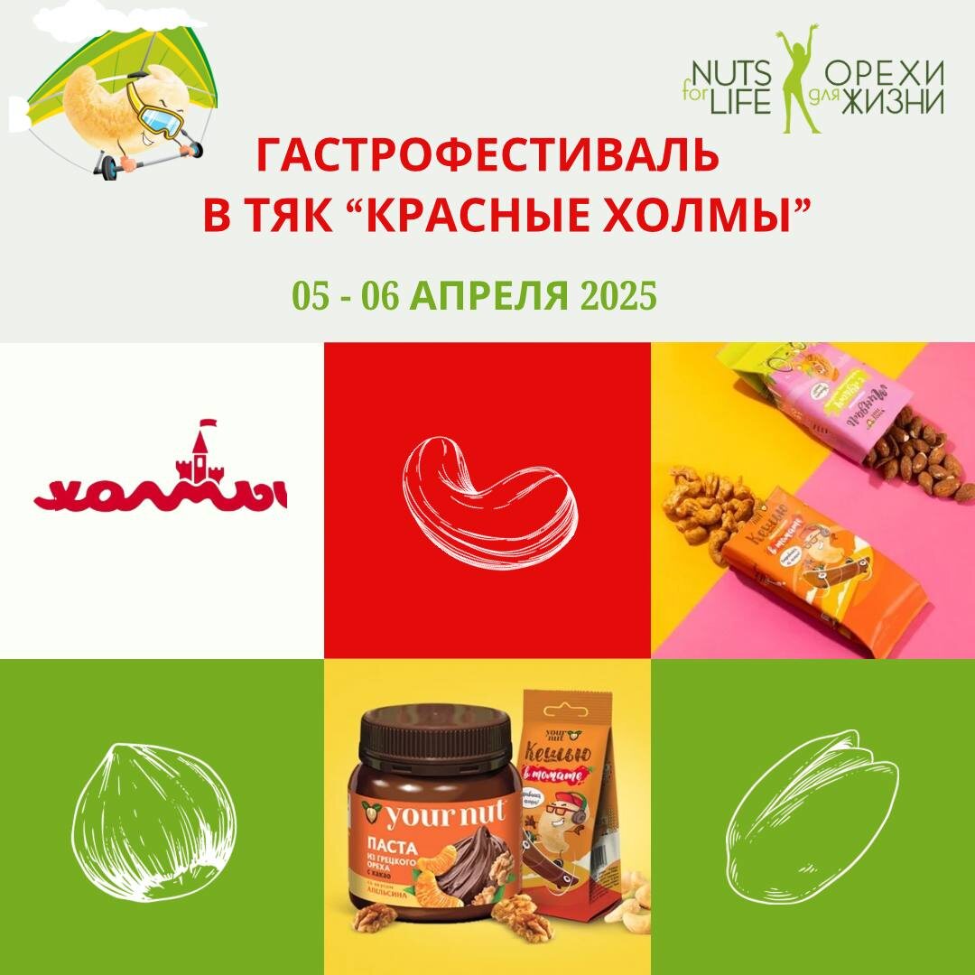 Теплый апрель начинается с вкусного события! Друзья! Ждем вас на Гастрономическом фестивале, который пройдет 05-06 апреля в ТЯК Красные Холмы, где каждый хруст - это история, а каждый аромат -это эмоция!🧡 Каждый год мы участвуем в фестивале, где встречаем наших друзей, которые всегда ждут своих "любимчиков" : кешью с луком, миндаль с прованскими травами, арахис с медом и кунжутом, ореховые пасты! Приходите с друзьями и близкими!🌱 Превратим выходные в маленький вкусный праздник!❤️ С любовью, ваш Nuts for life.💚