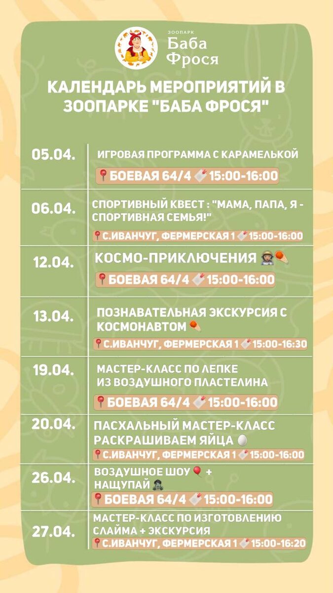 Скучно не будет ни минуты! Приходите всей семьёй, заряжайтесь эмоциями и весельем. 🦁✨
