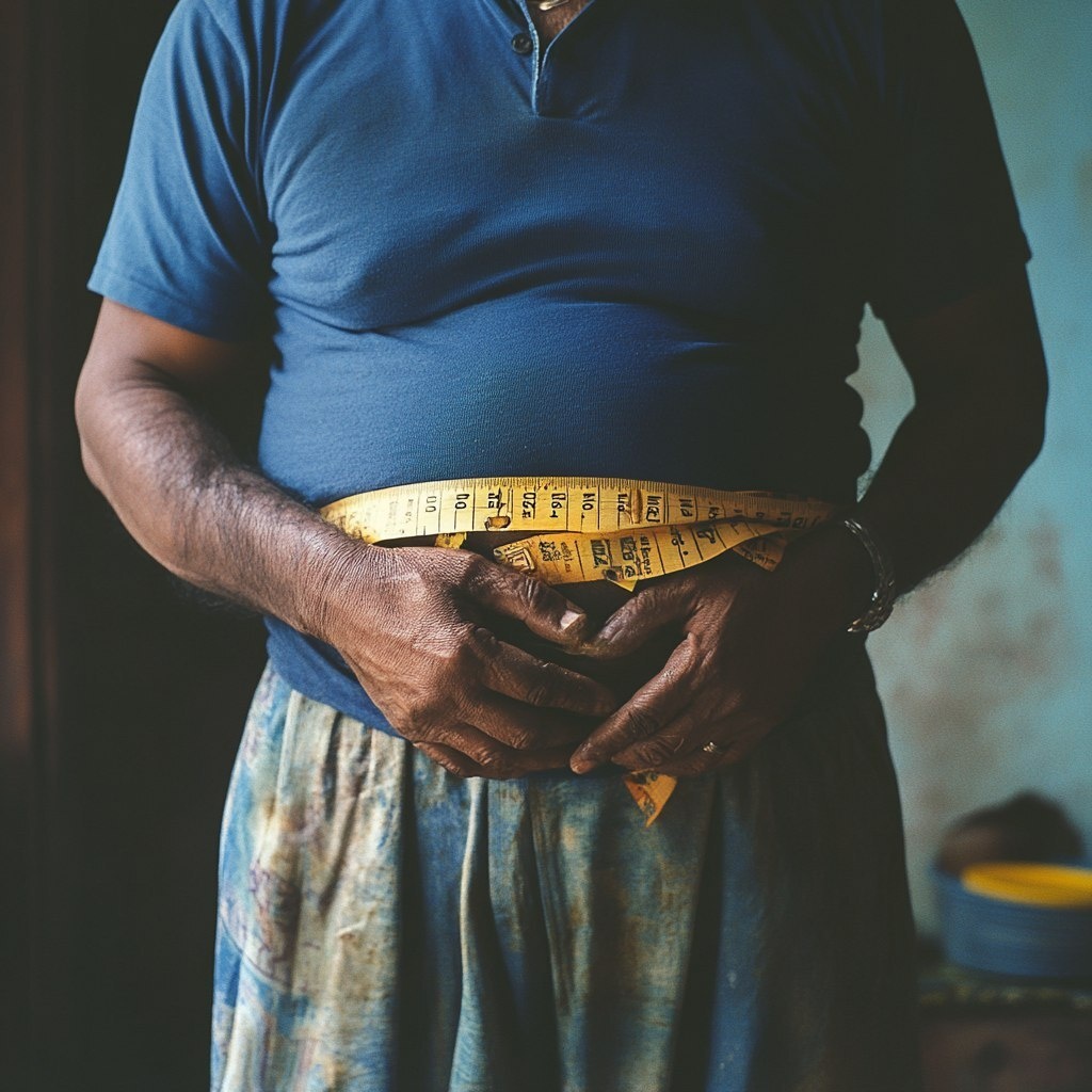 Создано на основе запроса: Realistic photo of a 40-year-old overweight Indian person wearing a blue t-shirt, with a measuring tape properly wrapped around their belly. Focus on the torso and hands. Natural indoor lighting, shot with a 50mm lens. --- Автоперевод: Реалистичная фотография 40-летнего индейца с избыточным весом в синей футболке с измерительной лентой, правильно обернутой вокруг живота. Необычно вышло? 🤔 https://dzen.ru/id/65c0c65c86e4f837c27b24d7 #ИИ #AI #нейросеть #midjourney #art