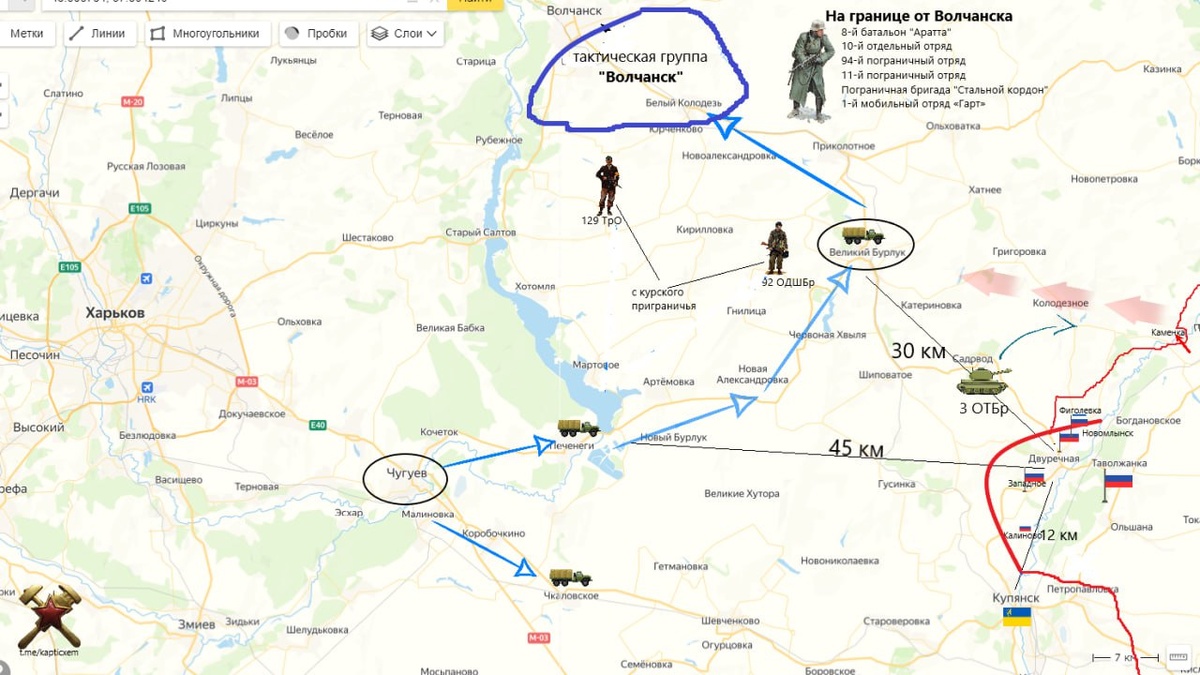 На карте нарисовал основную логистическую схему "волчанской" тактической группировки противника. Печенеги-Великий Бурлук-Белый Колодезь+несколько вспомогательных маршрутов по второстепенным дорогам низкой проходимости.