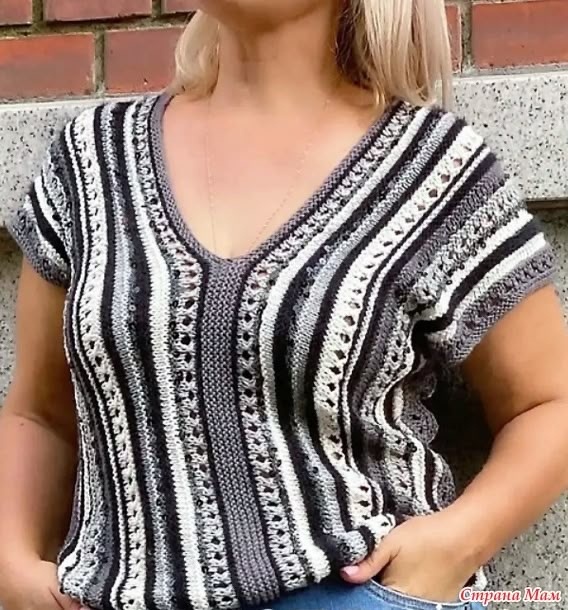 - Жилеты и топы, где полосы узора или цветные секции идут вертикально.