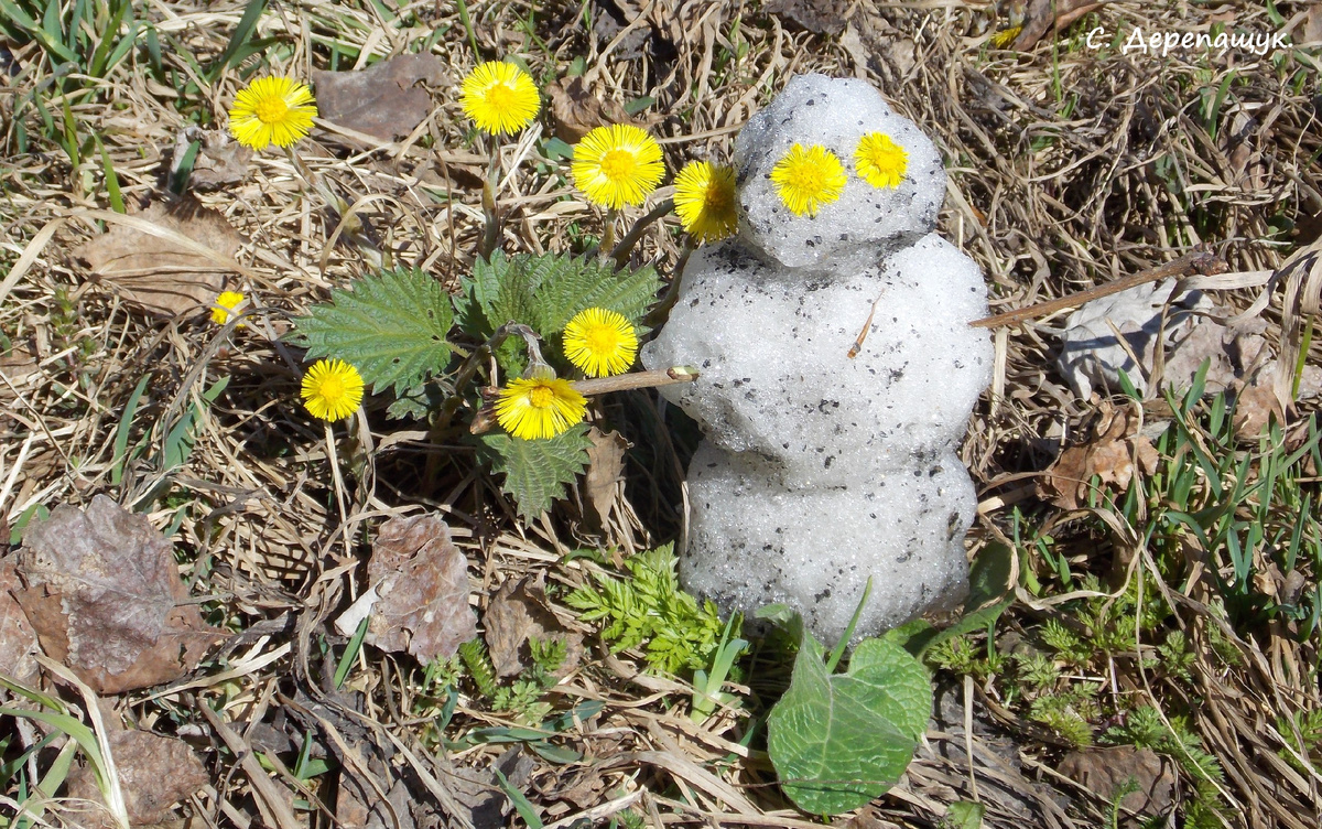 Ногами расковыряла, добыла из-под шлаков беленькое прошлое, слепила крохотульку-снеговичка, отнесла на солнечную цветущую поляночку с мать-и-мачехой, сфотографировала и оставила таять.
