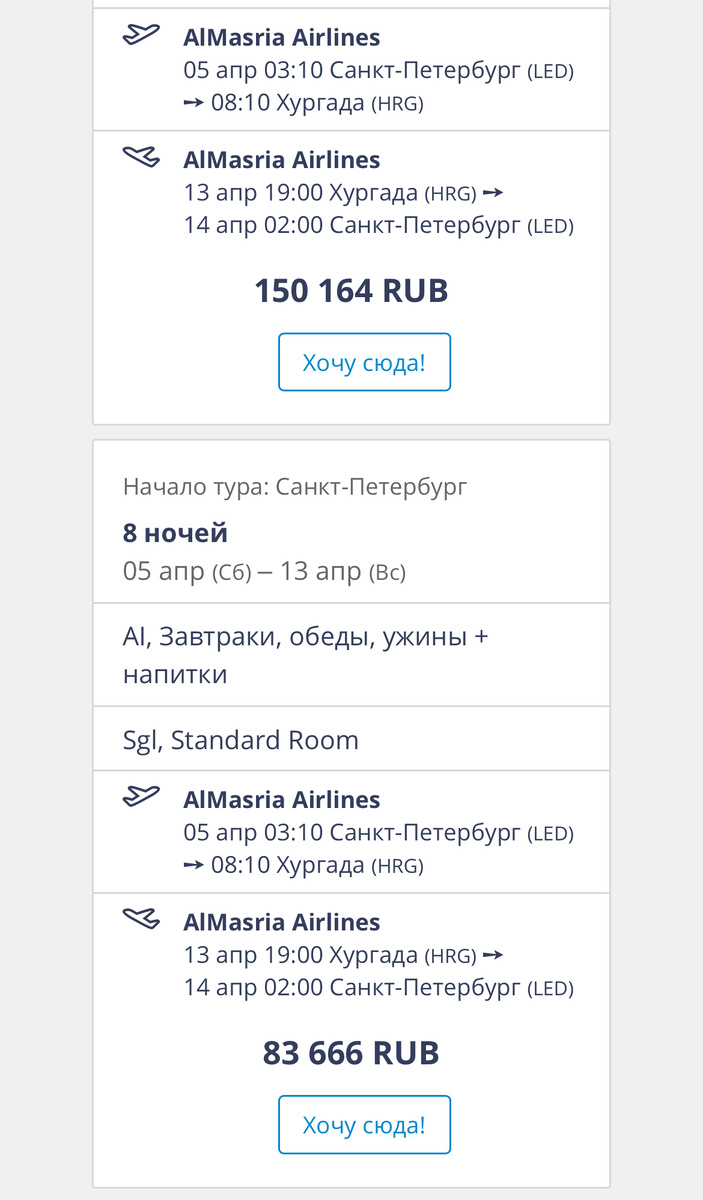 Недавно в блоге делилась мыслями, какие даты выбрать для отпуска Получается, угадала в выборе удачных дат на апрель. Тур удалось взять по очень адекватным (по нынешним мерам) ценам. За такую цену мы купили тур (первая цена за двоих, вторая за одного в отдельный номер): А вот так выросла цена на двоих уже на следующий день 😱 В этот раз мы летим втроем. Везем с мужем его папу в Египет. Он ни разу не был за границей и как-то сказал нам что мечтает увидеть пирамиды. Мы решили осуществить его мечту и полететь вместе 🥰 Будет такой семейный отпуск с одной стороны, а с другой, у мужа очень весёлый папа, с ним и потусить и поболтать не любые темы можно, даже на лютые, он всегда поддержит разговор. И когда мы стали собрать чемоданы, я поняла насколько важно иметь список самых необходимых вещей с собой. У меня в заметках сохранены все списки во все страны, где мы были, потому что если летели в первый раз, я всегда изучала страну и составляла этот список согласно погоде и нюансам локации. В
