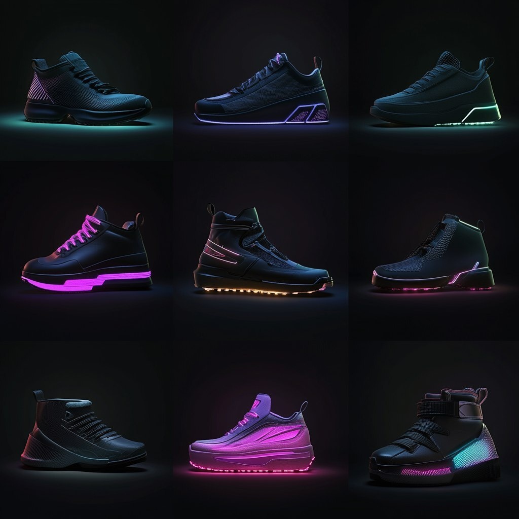 Создано на основе запроса: shoes collection, different angles, lineup, sneakers and boots, lookbook, renderings, variations, cyberpunk