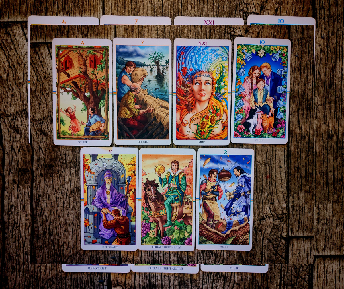 1. Его мысли о тебе. 4 жезлов В его голове у вас счастливые, крепкие и стабильные отношения. Он точно думает о таком сценарии развития, возможно даже строит планы и стратегию, как этого добиться. 2. Его чувства к тебе. 7 жезлов Чувства и эмоции очень сильно накатывают на него, особенно под влиянием, каких либо внешних обстоятельств. Но он старается зпщить себя от внешних триггеров. Видимо потому, что тогда, под влиянием эмоций, начинает рушится привычная, картина мира. 3. Его планы на тебя. 21 старший аркан Мир Он хотел бы закончить тот период, который в вас идёт сейчас и перейти наконец-то на новый этап отношений. 4. Его истинная цель быть с тобой. 10 чаш Одна из самых позитивных карт в колоде. Она говорит о любви, взаимной поддержке, сильных чувствах и крепких отношениях, основанный на сильной эмоциональной связи. Все это он хотел бы иметь именно с тобой. 5. Хорошие моменты в отношениях. 5 старший аркан Иерофант Это тот вариант отношений, когда оба партнёра смогут очень