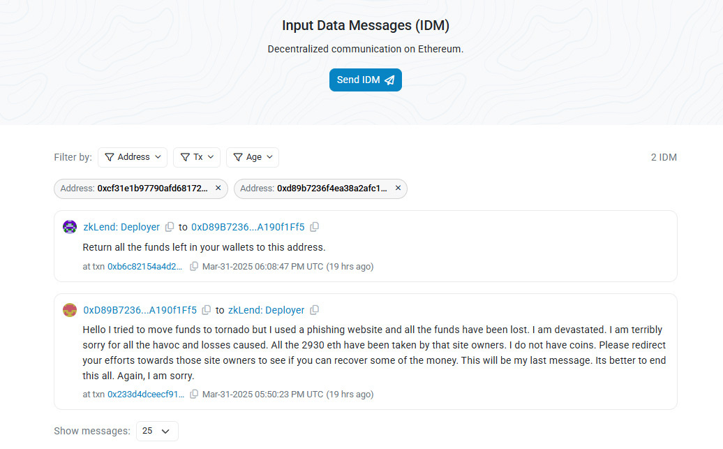 Злоумышленник попытался отмыть 2930 ETH стоимостью около $5,5 млн через известный криптомиксер Tornado Cash. Однако вместо оригинального сервиса он отправил ETH на фишинговый сайт. В результате все средства ушли к другим мошенникам, что подтвердили аналитики Lookonchain.
