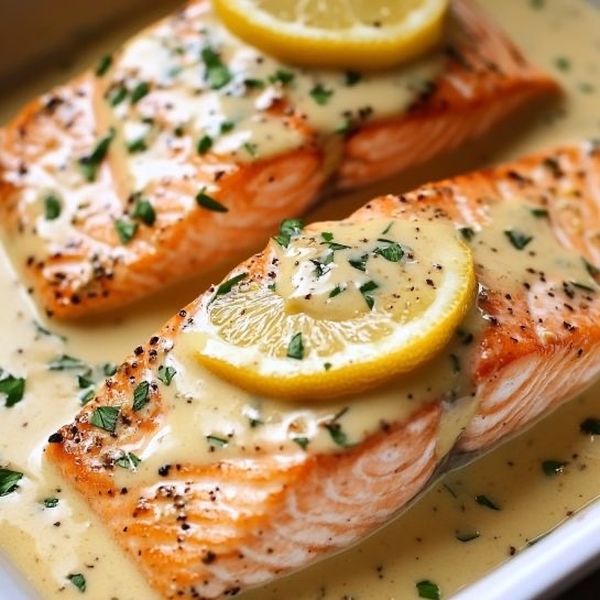 - Выложите лосось на тарелку, полейте соусом.