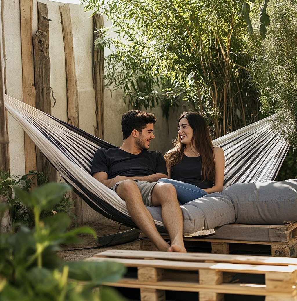 Создано на основе запроса: A young couple relaxing in an outdoor hammock, surrounded by plants and wood accents. The man is wearing black shorts with white stripes and has short hair, while the woman wears dark blue jeans and smiles at him as they sit close together on gray cushions. In front of them lies another cushion, and behind it stands wooden furniture made from pallets. It's sunny outside, creating a relaxed atmosphere that captures their joy for each other and the nature around them.