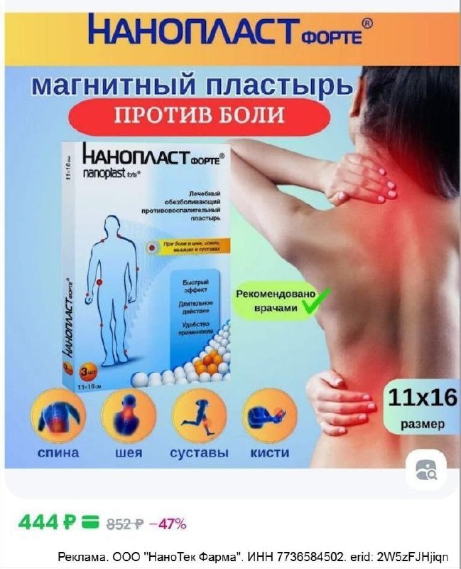 На такие случаи есть проверенное средство НАНОПЛАСТ форте – лечебный пластырь с наночастицами, который улучшает кровообращение и помогает расслабить мышцы, снять напряжение и боль. Он безопасен, так как не содержит гормонов и НПВС. Удобен в использовании: просто наклеил пластырь нужного размера перед сном, а утром спина уже в норме.
