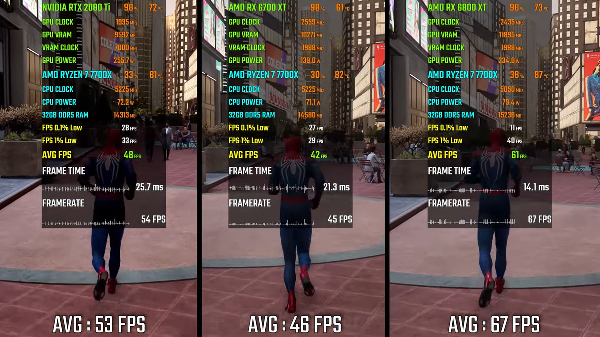 Marvel’s Spider-Man 2 запускалась с графикой Very High. Средняя производительность здесь составляла 59 к/с (RTX 2080 Ti), 46 к/с (RX 6700 XT) и 67 к/с (RX 6800 XT).