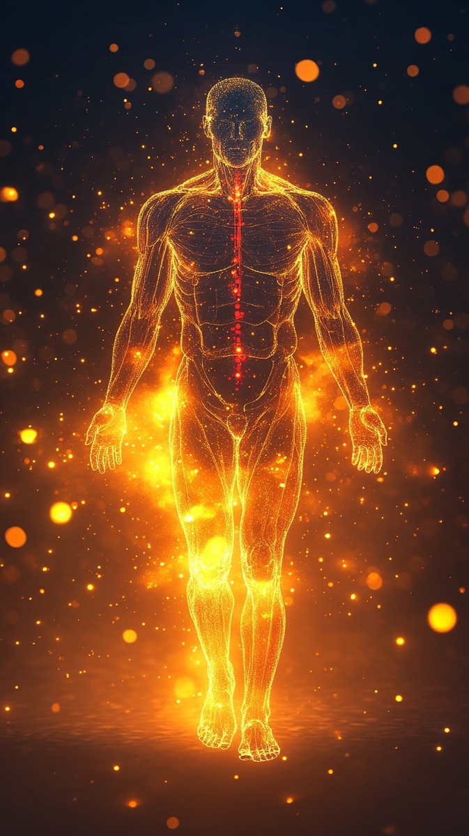 Создано на основе запроса: A highly detailed and realistic composite image showing a transparent view of a healthy human body, with soft glowing light moving outward from the core, symbolizing detoxification. Toxins are visually represented as dark particles or mist exiting the body through the skin or breath. Simultaneously, the hands and feet are shown glowing warmly with red or golden light to indicate improved circulation and warmth. Scientific and clean design, anatomical but artistic, soft background, health-focused --- Автоперевод: Высоко подробное и реалистичное составное изображение, показывающее прозрачный вид здорового человеческого тела, с мягким светящимся светом, движущимся наружу от ядра, символизируя детоксикацию. Как тебе такая генерация? 🤔 https://dzen.ru/id/65c0c65c86e4f837c27b24d7 #ИИ #AI #нейросеть #midjourney #art