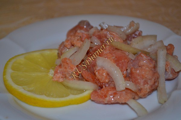 Салат из семги Ингредиенты: Семга свежемороженая - 400 гр. (или охлажденная) Лук репчатый - 1 шт. Лимон - 1 шт. (сок 0,5 лимона) Соль - 10 гр. Перец черный молотый - 10 гр. Уксус столовый 9 процентный - 30 мл. (2 ст. л.) Источник: https://rusdinner.ru/page/salat-iz-semgi