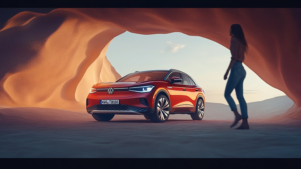 Создано на основе запроса: shot from a ground perspective of a red volkswagen tayron suv during night in front of a huge sand shape like