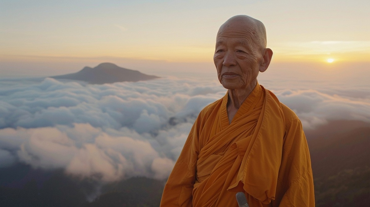 Создано на основе запроса: a deeply wise and compassionate elderly Zen Buddhist monk, around 90 years old, standing at the top of a misty