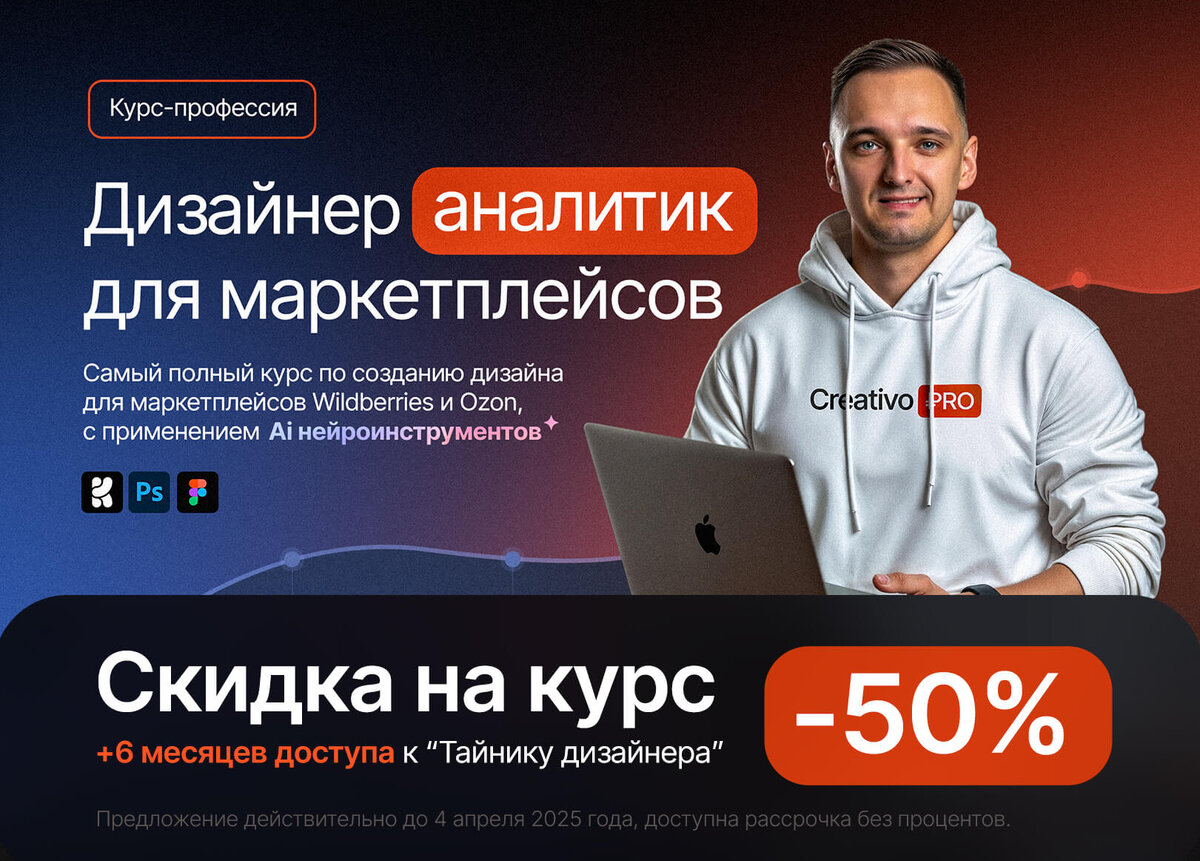 За 3-6 месяцев вы создадите мощное портфолио, где у вас будет 6+ крутых кейсов. +На днях мы добавили новую главу по работе с AI-нейроинструментами и теперь вы будете создавать стильный дизайн еще быстрее. На данный момент это самый полный курс по дизайну для маркетплейсов Ozon и Wildberries. Вы освоите профессию с нуля и начнете зарабатывать на дизайне. 👇ЗАБРОНИРОВАТЬ МЕСТО