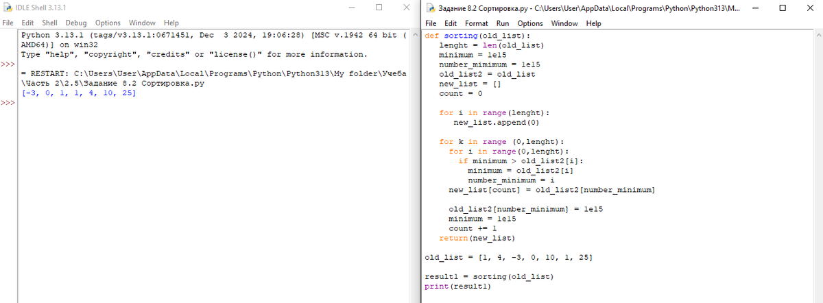 Дан список из N чисел. Напишите программу, которая сортирует элементы списка по возрастанию и выводит их на экран. Дополнительный список использовать нельзя. Также нельзя использовать готовые функции sorted/min/max и метод sort Постарайтесь придумать и написать как можно более эффективный алгоритм сортировки. Пример: Изначальный список: [1, 4, –3, 0, 10] Отсортированный список: [–3, 0, 1, 4, 10] Код (мой личный - до проверки учителем)- патент: def sorting(old_list): lenght = len(old_list) minimum = 1e15 number_mimimum = 1e15 old_list2 = old_list new_list = [] count = 0 for i in range(lenght): new_list.append(0) for k in range (0,lenght): for i in range(0,lenght): if minimum > old_list2[i]: minimum = old_list2[i] number_minimum = i new_list[count] = old_list2[number_minimum] old_list2[number_minimum] = 1e15 minimum = 1e15 count += 1 return(new_list) old_list = [1, 4, -3, 0, 10, 1, 25] result1 = sorting(old_list) print(result1) В общем, изначально было сказано, что нельзя использовать до