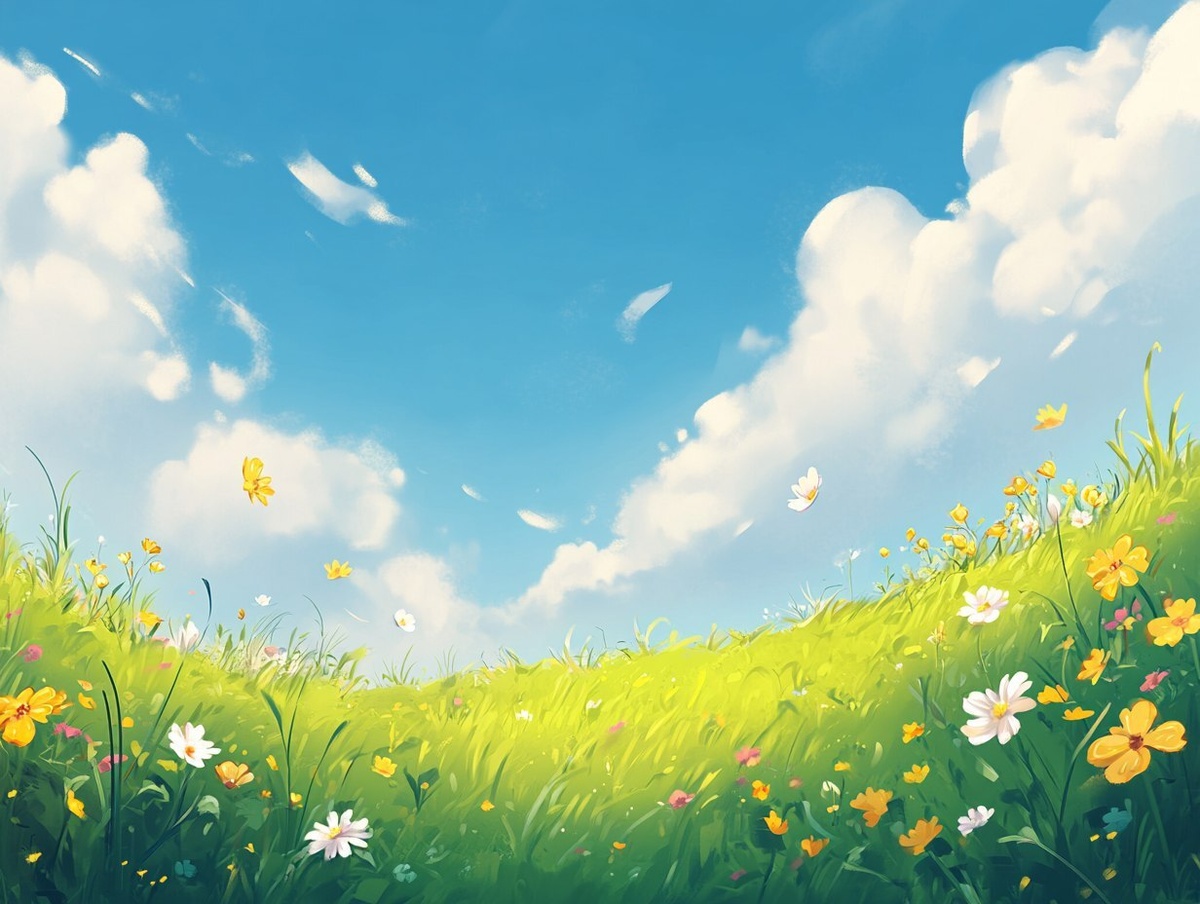 Создано на основе запроса: Clear blue sky, some white clouds, green grass with flowers on it