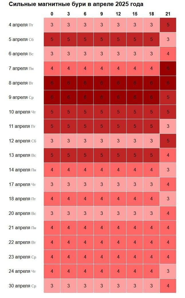 Апрель станет настоящим испытанием для метеозависимых людей: нас ожидают 19 дней магнитных бурь подряд. Почти весь месяц планета будет находиться под воздействием солнечных вспышек. Из 30 дней месяца в 19 ожидаются сильные возмущения магнитного поля. В это время могут возникнуть головные боли, упадок сил и депрессии. Не забудьте предупредить своих близких и родных о возможных негативных последствиях.