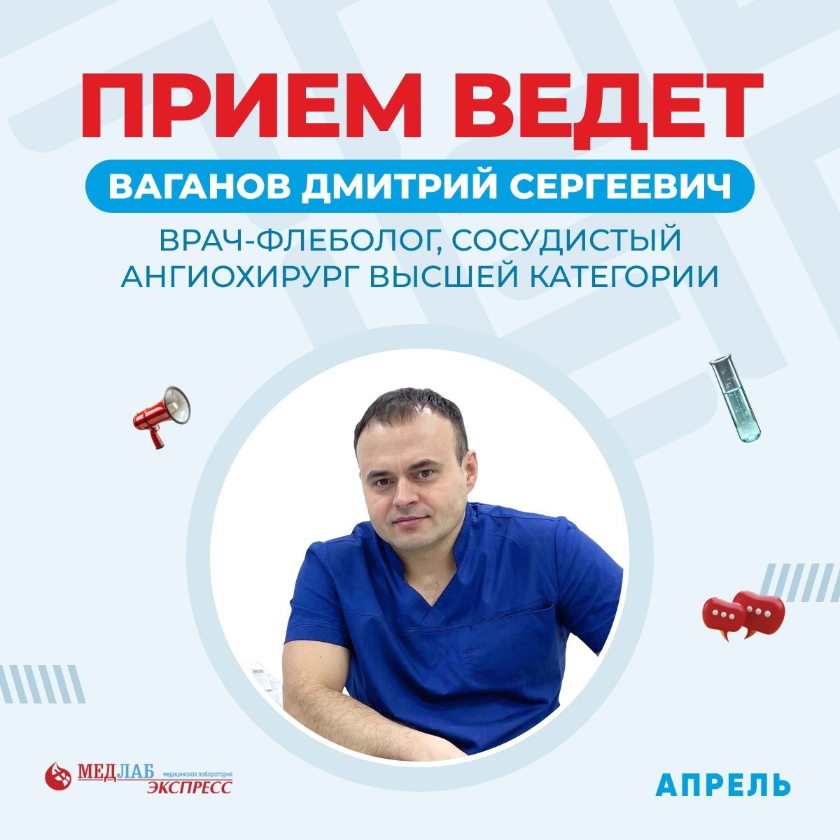Делимся расписанием флеболога на АПРЕЛЬ🙌 Кто такой флеболог? Флеболог - это врач, специализирующийся на диагностике и лечении заболеваний вен. Он помогает в решении проблем, связанных с варикозным расширением вен, тромбофлебитом и другими венозными патологиями. Если у вас есть неприятные ощущения в ногах, отеки или видимые изменения на коже, не откладывайте визит к специалисту! 📅 6 апреля - прием в г. Губаха 📅 13 апреля - прием в г. Чернушка 📅 20 апреля - прием в с. Уинское В нашей лаборатории прием ведет Ваганов Дмитрий Сергеевич – сосудистый ангиохирург высшей категории со стажем более 20 лет. Запись: 240-40-40 или 8 (800) 222-20-40 Берегите свое здоровье! 💙
