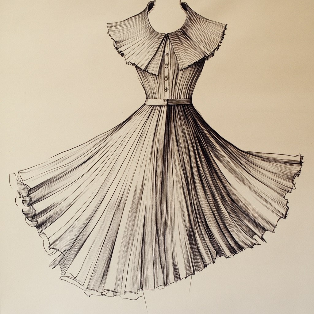 Создано на основе запроса: A fashion design where the collar of a shirt, instead of staying at the neck, extends down to the waist, forming a voluminous skirt. The collar becomes a large, dramatic, and structured element that transforms into a full skirt at the waist. The skirt should have a flowing, voluminous appearance, like a pleated or A-line design, and the entire garment should focus on this unique transformation from collar to skirt. The materials should be a combination of structured fabric for the collar and soft, flowing materials like silk or organza for the skirt. The design should be avant-garde, with a bold and experimental look