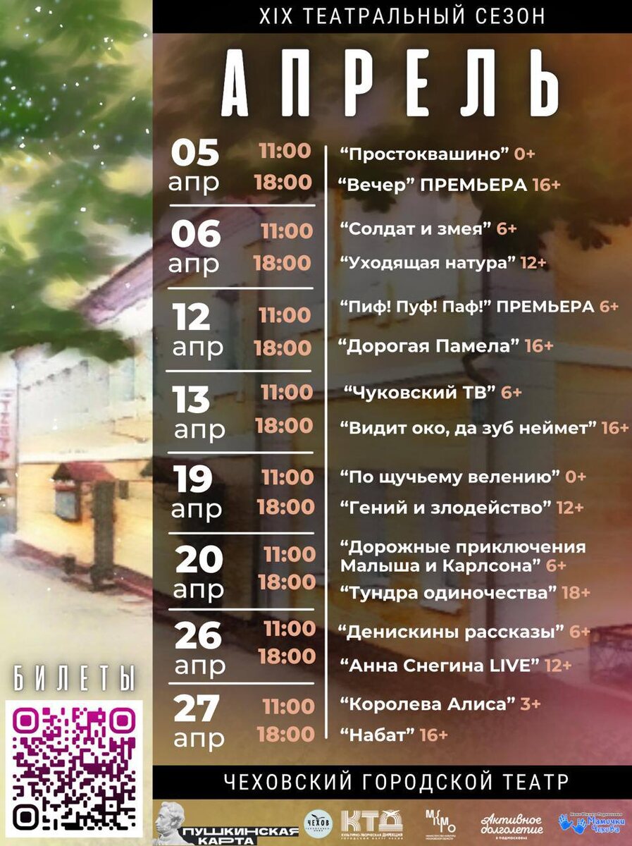 ✨ Афиша на апрель ❤️ от Гортеатра 🎟️ КУПИТЬ билеты можно здесь: https://iframeab-pre6643.intickets.ru/shows/ 🏢 «ЧЕХОВСКИЙ ГОРОДСКОЙ ТЕАТР» 📍 г. Чехов, ул. Московская, д.40 ✅ Мероприятия Чехов https://dzen.ru/id/66cc4b48e9ef144699238a51 http://vk.com/chekhov_events http://dzen.ru/chekhov_events