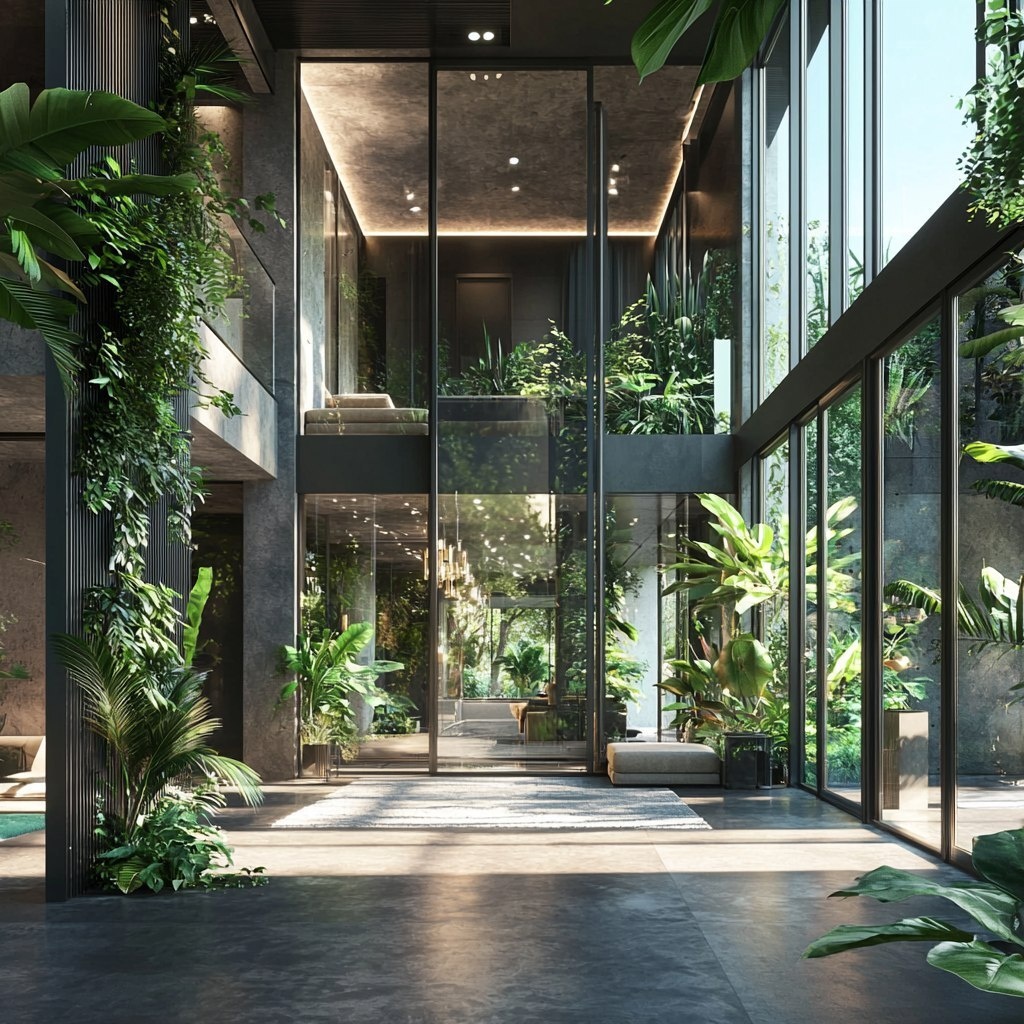 Создано на основе запроса: "Luxury interior design with abundant greenery, featuring a combination of gray aluminum, glass, and metal wood materials. The atmosphere is sophisticated and opulent, inspired by the lavish style of Dubai. Elegant and spacious spaces, with contemporary furniture and plants seamlessly integrated. Large windows allowing natural light to fill the space, offering a view of lush outdoor gardens. Sleek and modern design with minimalist yet striking features, blending nature and futuristic materials.