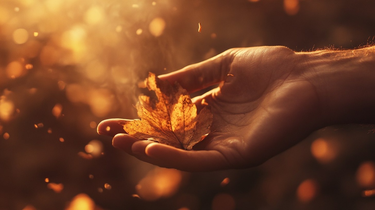 Создано на основе запроса: a close-up of a gentle hand letting go of a dried autumn leaf, wind carries it away softly, golden light and