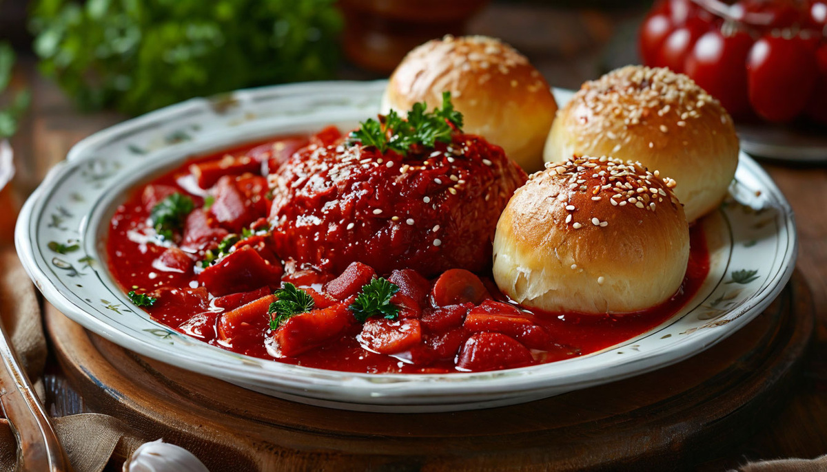 Подавайте украинский борщ горячим, посыпав свежей зеленью, с пампушками и сметаной.