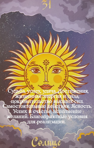 Смягчает значение негативных карт. Облегчает любую ситуацию. Будущее Карта предсказывает, что состояние уныния и неверия в свои силы скоро пройдёт, это временное явление, а всё самое лучшее у вас ещё впереди. Начала положительных перемен можно ожидать в сроки до одного года. Отношения Счастливые, искренние отношения. Яркие и оптимистичные отношения. Страстные связи и пылкие свидания. Плодотворные отношения. Любовь, в которой нет места эгоизму, корысти и обману. Зрелые чувства с самыми серьёзными намерениями. Благоприятный период для начала новых отношений. Работа, бизнес и финансы Воп