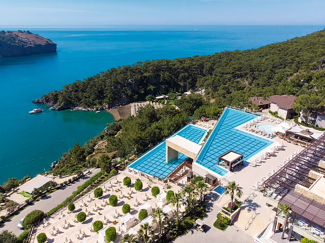 На побережье Турции, где бирюза воды сливается с золотистым песком, отель, словно высеченный из самой скалы, простирается вниз с вершины скалистого утеса, его территория безупречно благоустроена.