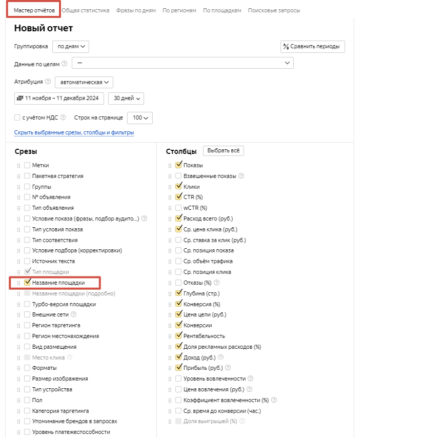Возможность доступна для Единой перфоманс-кампании. Для Мастера кампаний ее нет. Но существует хитрый способ доступа. Если на логине ведутся кампании ЕПК, переходим в этот отчет, после в выпадающем списке выбираем номер необходимой кампании типа «Мастер» – и попадаем в отчет по площадкам для нее.