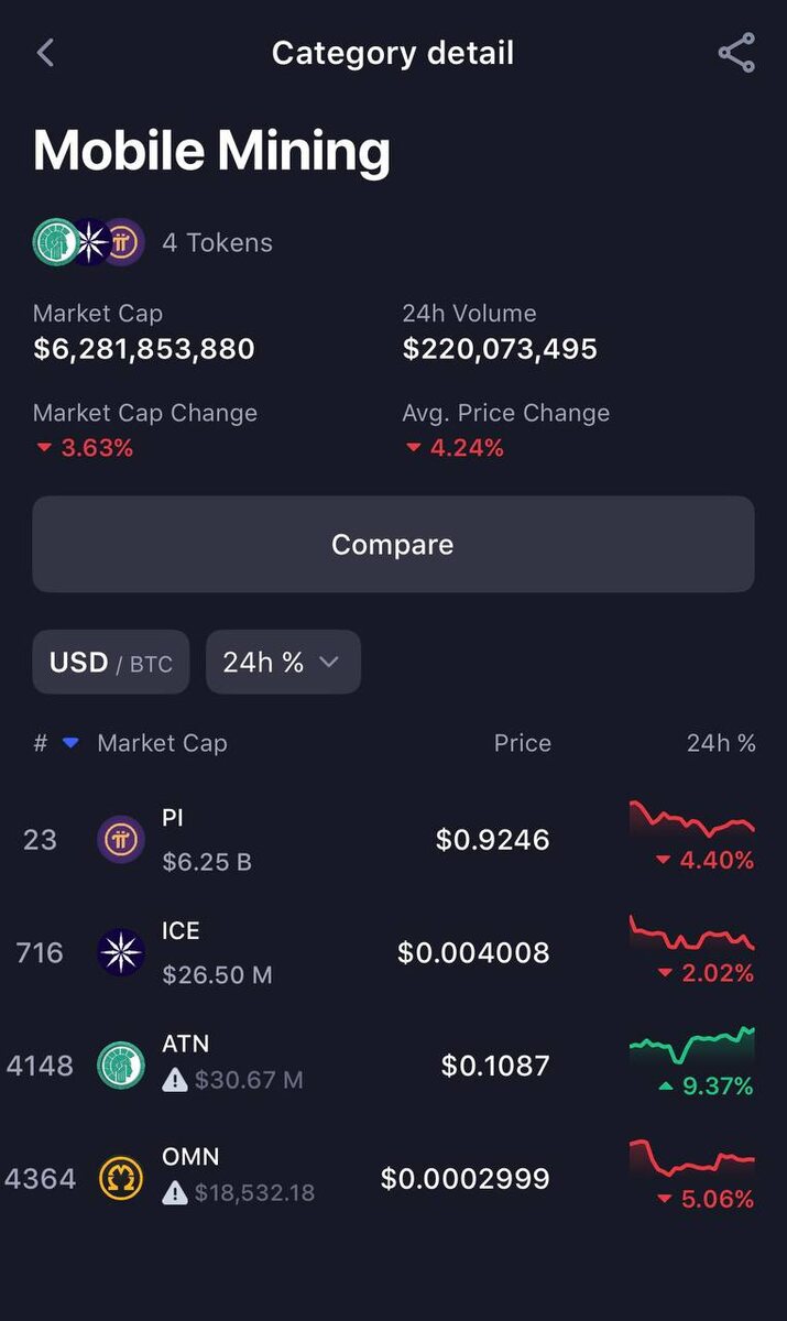 🚀 Прорыв в криптомире! Теперь мобильный майнинг стал отдельной категорией на CoinMarketCap, а Pi Network (𝛑) возглавляет этот сегмент с рыночной капитализацией 6,25 млрд долларов.