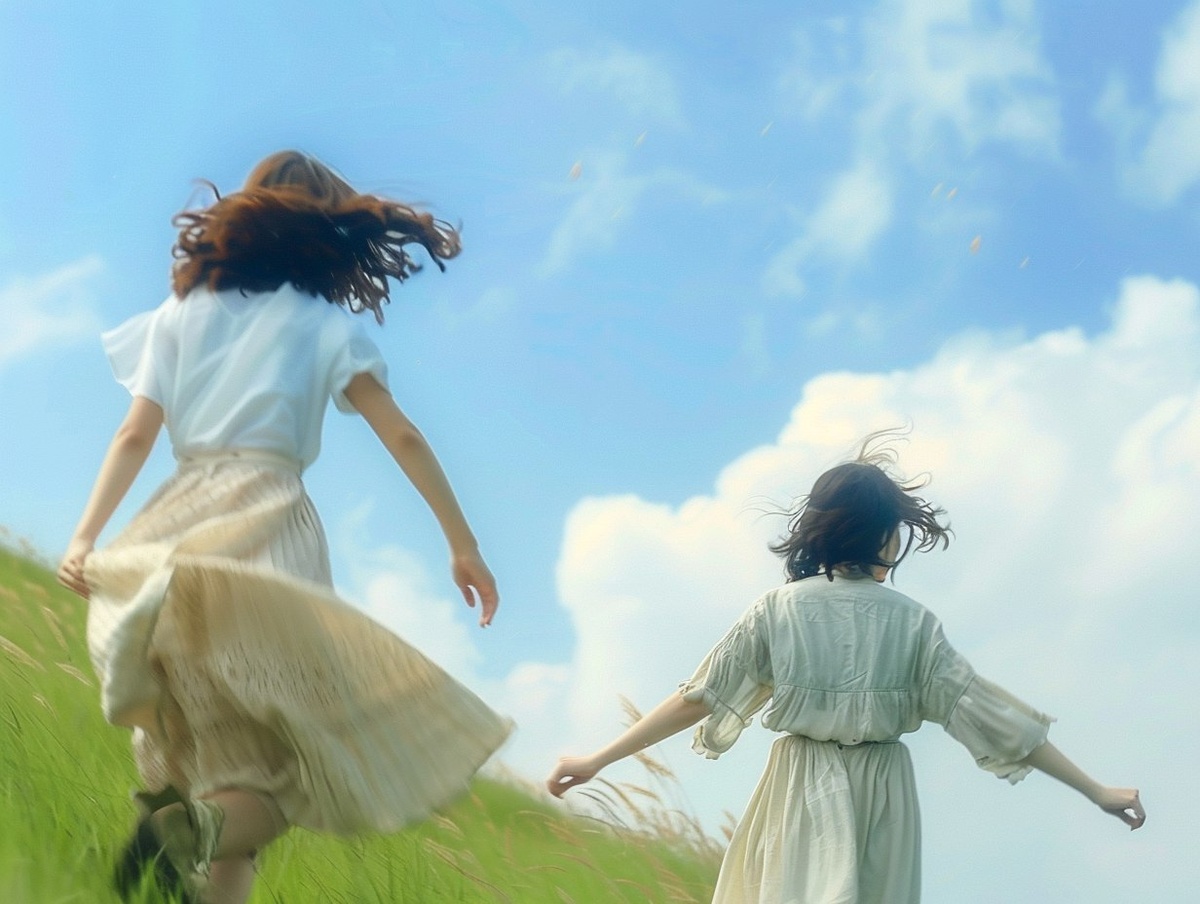 Создано на основе запроса: The sky is white and the green grass slope, two girls run into the distance, the picture reflects chasing the wind and freedom; Photographic style