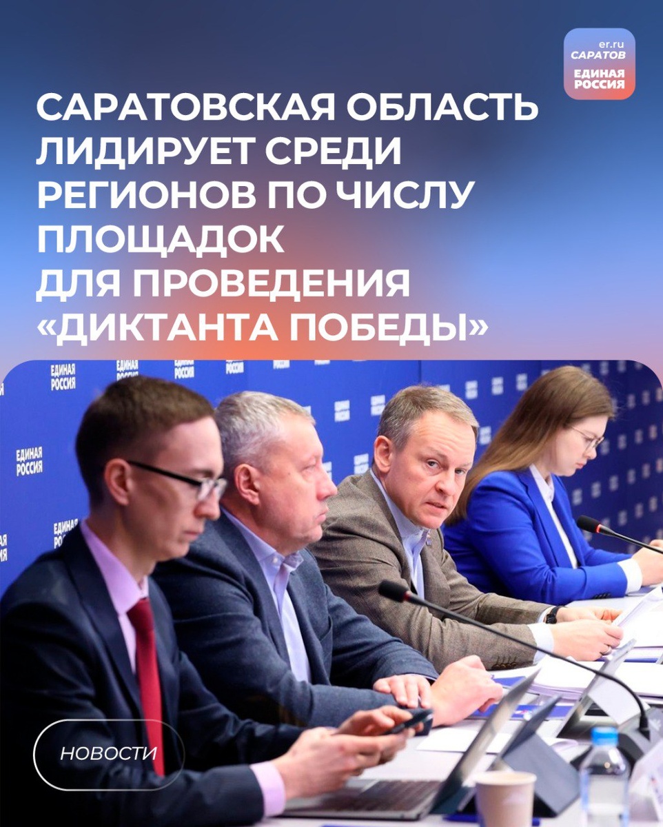 ✍🏼 В этом году Международная историческая акция Единой России Диктант Победы пройдет 25 апреля более чем на 30 тысячах офлайн-площадок. Их количество уже превысило показатели прошлого года. Они будут разные. Участие примут и дружественные страны. И жители освобожденных территорий. «Мы ставили себе задачу, что в Год 80-летия Победы количество площадок диктантпобеды.рф будет не меньше, чем в прошлом году. До диктанта ещё четыре недели, а оно уже превысило цифры 2024 года на несколько тысяч. Лидеры по количеству зарегистрированных мест для проведения теста – Саратовская и Самарская области. В каждом из этих регионов откроется более 1600 площадок», - рассказал руководитель центрального исполнительного комитета партии «Единая Россия» Александр Сидякин. 💬«Саратовская область уже традиционно в числе лидеров по проведению «Диктанта Победы». Жители активно принимают участие в патриотической акции, многие заранее начинают готовиться для того, чтобы показать знания по истории Великой Отече