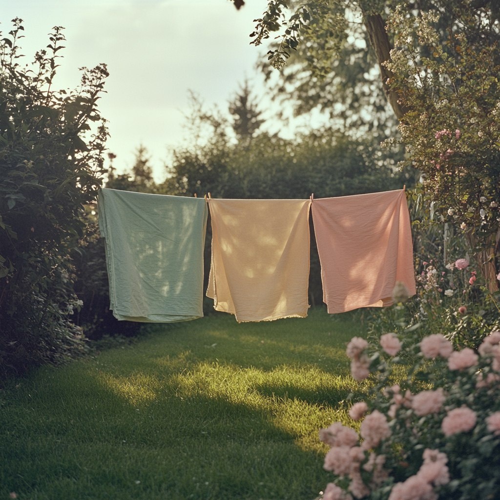 Создано на основе запроса: two pastel-colored bedsheets are hung up to dry in a spring garden. a gentle breeze makes the bedshhets sway. the composition is minimal, there's a green lawn and some flower bushes. Early morning light, a little before sunrise, the scene is calm and cosy, Photorealistic, grainy film