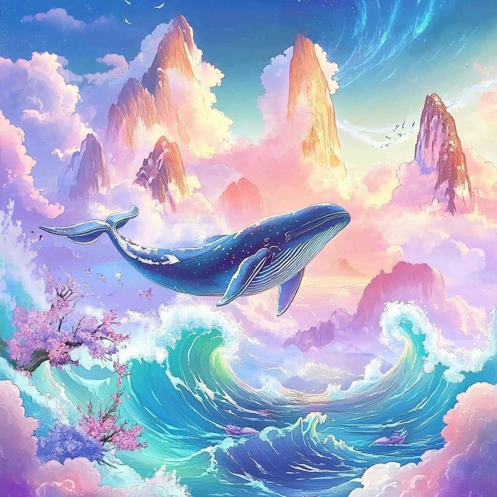 Создано на основе запроса: whale swims in the sea, Waves are shaped like Korean-style clouds, The sky is a bright neon light