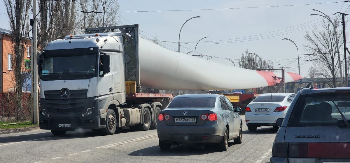 На развязке улицы 2-й Бетонной, Цимлянского шоссе и Романовского шоссе возник транспортный затор. Причиной автомобильной пробки является перевозка лопастей для ветроэлектростанции (ВЭС).