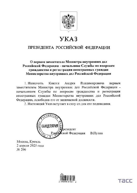 Сегодня, 2 апреля 2025 года президент России Владимир Путин учредил в России службу для мигрантов. Её возглавил замгенпрокурора Андрей Кикоть.