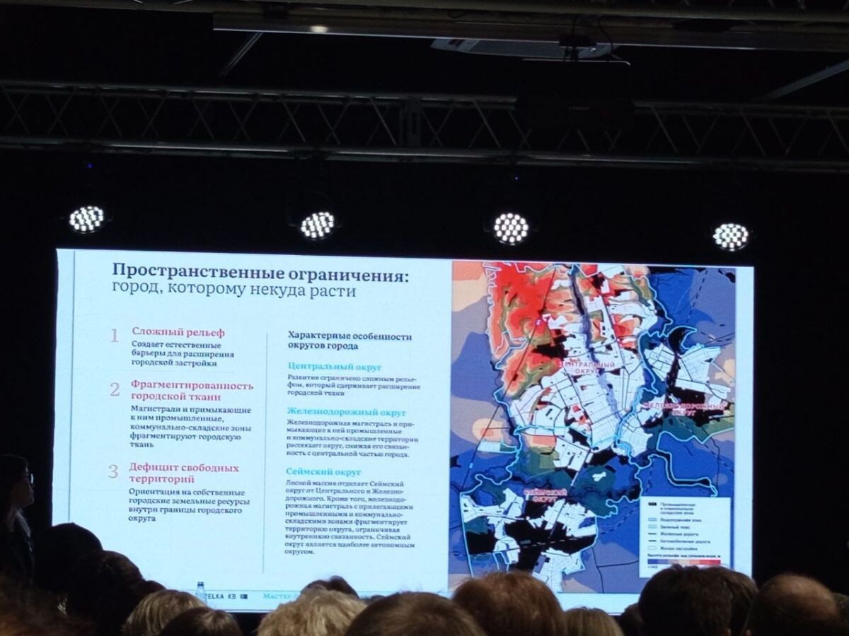 Курску некуда расти, по причинам сложного рельефа, магистралей и примыкающих к ним коммунально-складских зон и дефицита территорий, отметила директор проектов "КБ Стрелка" Анна Ленц. В Курске на каждого жителя приходится квадратный метр торговых площадей. Порядка 67% застроенных территорий - это ИЖС. Город очень комфортный, даже в Воронеже на 25% меньше частных застроек, добавила Ленц. Планируется центр Курска использовать "на полную", его будут развивать от Московских до Херсонских ворот. Хинштейн задал вопрос - есть в зале хоть один человек, которого устраивает состояние Курска сейчас? В ответ - тишина. "Ну вы вдумайтесь, 70 ТЦ! И одно место отдыха, где две машины разъехаться не могут", - добавил врио губернатора Курской области.