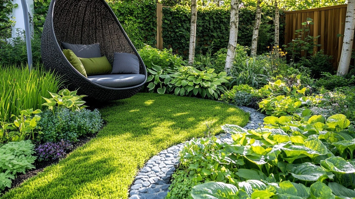 Создано на основе запроса: shaded garden zone with woodland perennials like hosta, carex, epimedium, soft moss ground cover, elegant lounge