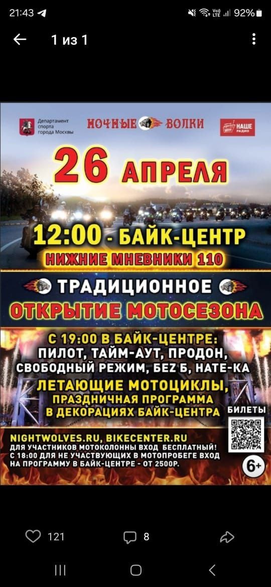 Открытие мотосезона от Ночных Волков в Москве состоится так же 26 апреля.