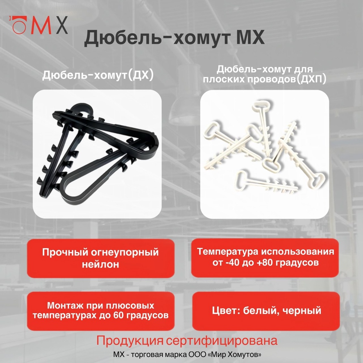 В наличии на складе дюбель-хомуты для электромонтажных работ. 1. Дюбель - хомут (ДХ) МХ.(https://www.homut.ru/catalog/dyubel_khomut/) Используется: для соединения кабелей, пучков проводов, гибких труб, жестких труб к любой твердой поверхности. 2. Дюбель-хомут для плоских проводов (ДХП) МХ.(https://www.homut.ru/catalog/dyubel_khomut_dlya_ploskikh_provodov/) Используется: для быстрого соединения кабеля к поверхностям из бетона или кирпича. 5 фактов о дюбель - хомутах МХ: 1. Прочный огнеупорный нейлон; 2. Монтаж при плюсовых температурах до 60 градусов; 3. Температура использования от -40 до +80 градусов; 4. В наличии в белом и черном цветах; 5. Имеют сертификат качества. 🗣️Подробнее можете ознакомиться в каталоге.(https://www.homut.ru/catalog/plastikovye_styazhki/) 📑Если нужна консультация специалистов, позвоните нам +7(499) 403-13-24 или напишите на mx@homut.ru, WhatsApp.(https://wa.me/79581119082)