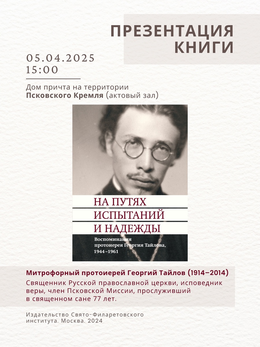5 апреля 2025 года в 15:00 в доме причта Свято-Троицкого кафедрального собора города Пскова состоится презентация книги воспоминаний протоиерея Георгия Тайлова «На путях испытаний и надежды».