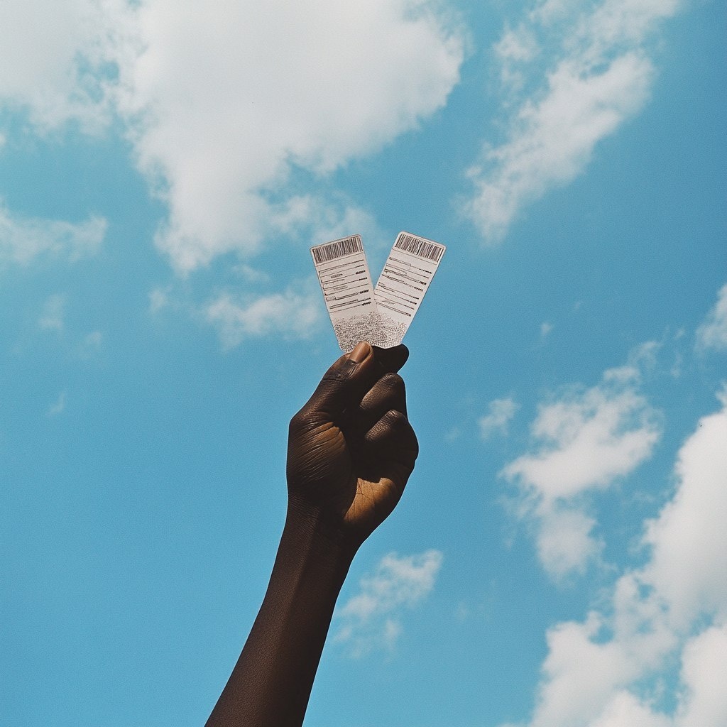 Создано на основе запроса: one black hand holding 2 tickets in the sky --- Автоперевод: Одна черная рука держит 2 билета в небе Отлично получилось? 🤔 https://dzen.ru/id/65c0c65c86e4f837c27b24d7 #ИИ #AI #нейросеть #midjourney #art