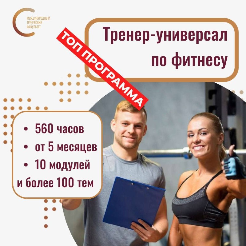 🔥 МЕЧТАЕТЕ СТАТЬ ВОСТРЕБОВАННЫМ ФИТНЕС-ТРЕНЕРОМ? ЭТО ВАШ ШАНС! 🔥 Представьте: Вы приходите в зал не как клиент, а как профессионал, который знает каждую мышцу, каждое движение и может превратить мечту в тело мечты. Но… 👉 Вам не хватает уверенности в знаниях, и Вы боитесь навредить клиенту? 👉 Не понимаете, как правильно составить программу тренировок? 👉 Хотите гарантированно стать востребованным специалистом и увеличить доход? Тогда программа "Тренер-универсал" в Педагогическом колледже фитнеса — Ваш билет в успешное будущее! ПОЧЕМУ ЭТО ИДЕАЛЬНЫЙ ВАРИАНТ ДЛЯ ВАС? ✅ 9 обязательных курсов — анатомия, физиология, биомеханика, питание, спортивная медицина и многое другое. Вы полностью разберётесь в работе тела и научитесь добиваться результатов. ✅ +1 курс на выбор — специализируйтесь на том, что Вам ближе: функциональный тренинг, йога, реабилитация и другие направления. ✅ Не нужно выбирать между групповыми и персональными тренировками — Вы сможете вести любые группы и расширить кл
