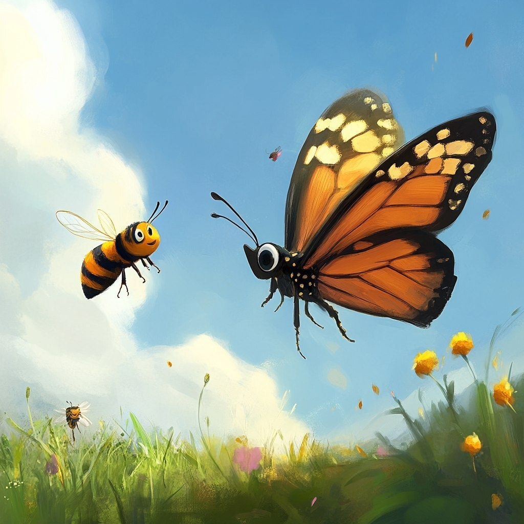 Создано на основе запроса: monarch butterfly and bumble bee talking while flying, pixar style