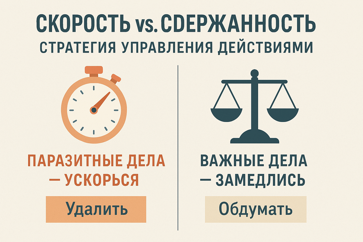 Важно понимать: не все дела требуют одинакового подхода по времени и энергии. Это фундаментальное осознание помогает выстроить эффективную модель поведения в быту, бизнесе и личном развитии. Почему не стоит спешить с важным: Тактический приём: Используй правило "паузы": на любое важное действие — стоп и контроль. Вводи временной буфер: 15 минут, ночь или день — для переосмысления. Что такое паразитные дела: Мелочи, которые "висят", не двигают тебя к целям, но отнимают ресурс. Это: Почему нужна скорость: Тактический приём: Используй метод "разгрузки за 15 минут": ставь таймер и просто «сжигай» хвосты. Не думай — действуй. Важное? — Замедлись. Обдумай. Паразитное? — Ускорься. Удали. Такой подход делает тебя рациональным, быстрым и сильным — без перегрузки и суеты. теги: #СтратегияДействий #УправлениеВременем #ВажноеИПаразитное #Продуктивность #ЛичностнаяЭффективность #МинимализмВДелах